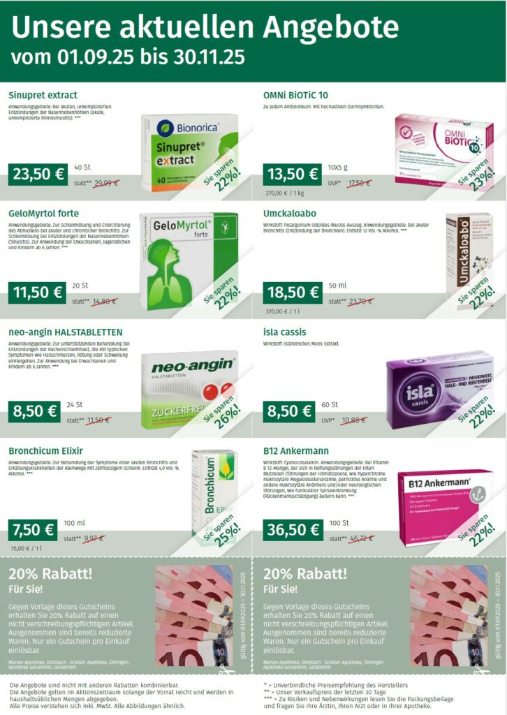 Im Quartal erscheint unser Angebots-Flyer. Hier finden Sie die saisonalen Produkte zu günstigen Preisen. Gerne können Sie den Angebotsflyer in unserer Apotheke mitnehmen oder hier herunterladen.